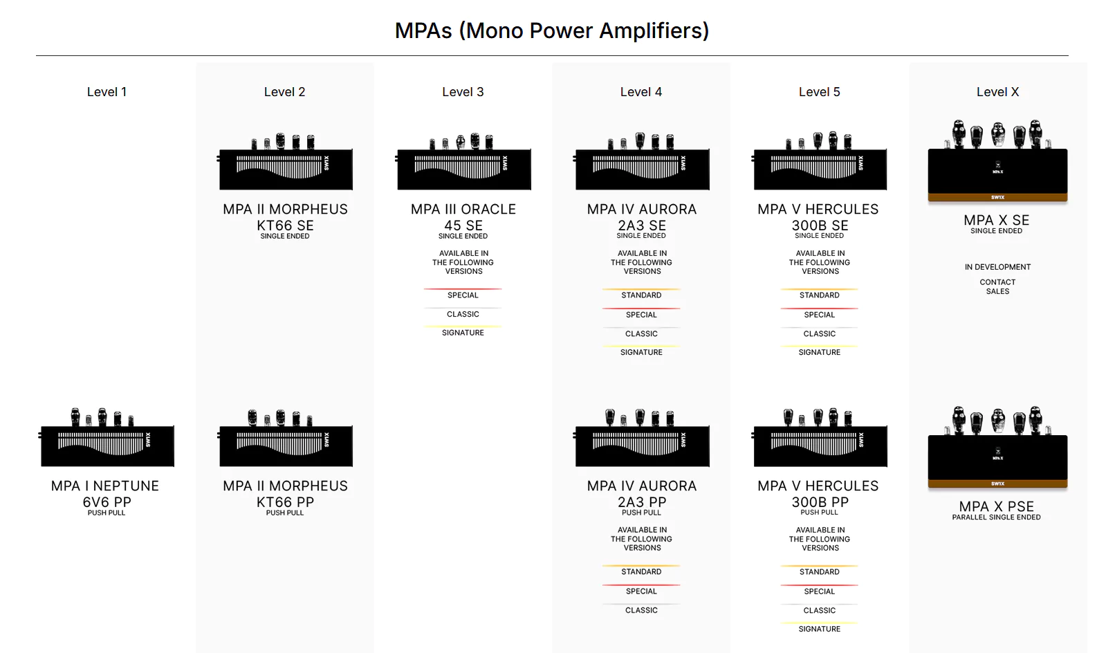 The Push Pull Versions are also offered in MPA II Morpheus KT66, MPA IV Aurora 2A3 & MPA V Hercules 300B Mono Power Amplifiers on special request.